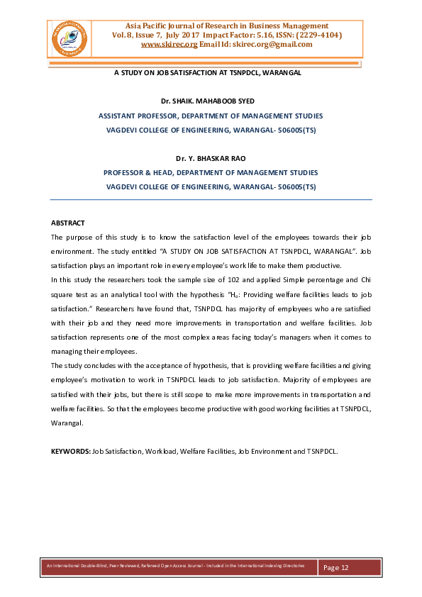 Pdf A Study On Job Satisfaction At Tsnpdcl Warangal Skirec Publication Ugc Approved Journals Academia Edu - The northern power distribution company of telangana limited has announced junior accounts officer recruitment notification, eligible candidates can apply online for.